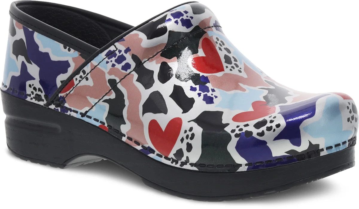 The Dansko ‘Professional’ is a popular choice with healthcare professionals. Nurses, for one, have commented on the comfort and stability during a 12-hr. shift. The heel-back in this ‘clog’ style shoe provides confidence and support. The fragmented colors with hidden hearts will be a fun accessory to most uniforms or smocks.